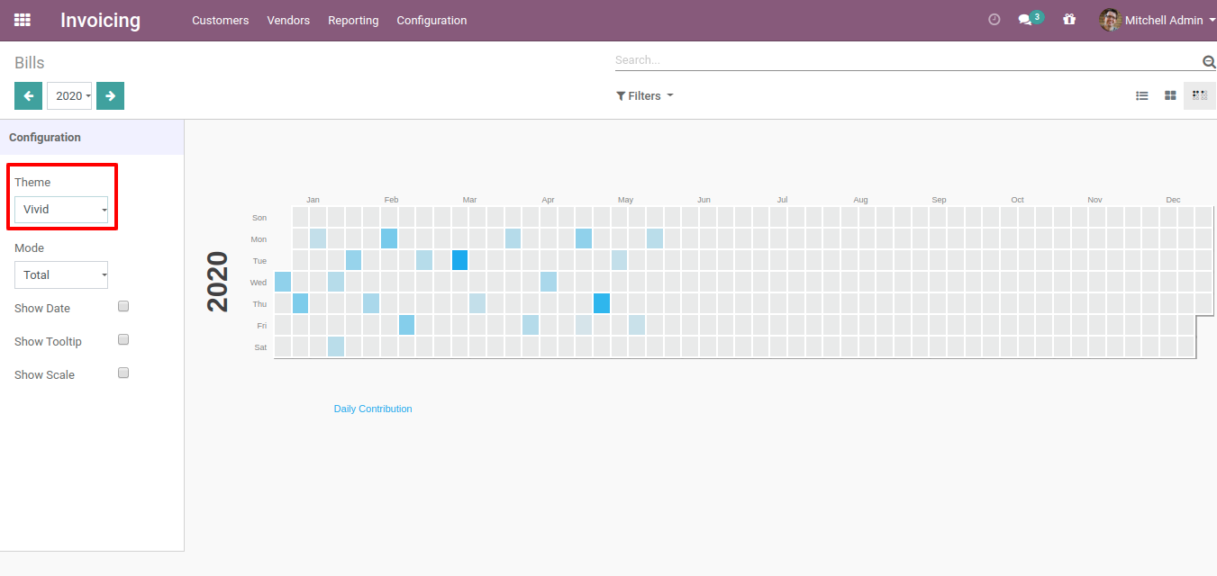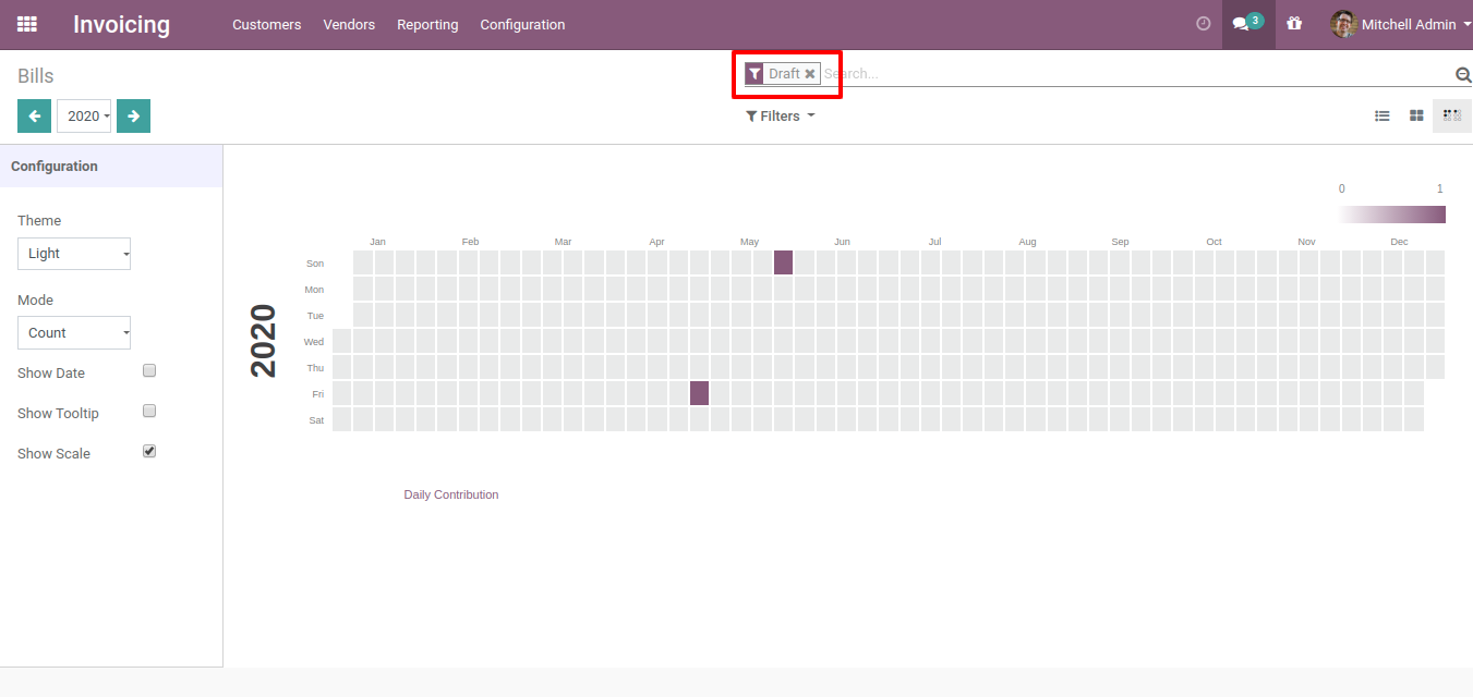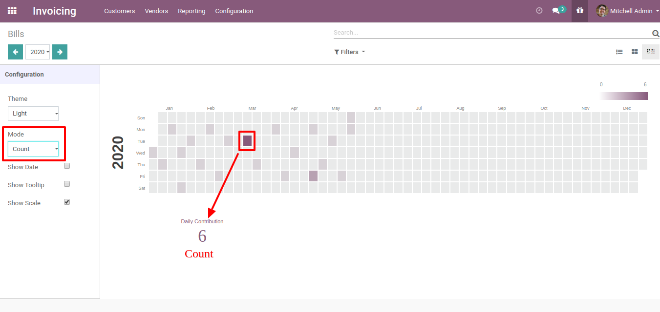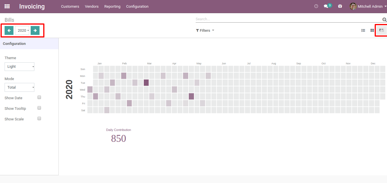 • Here, Calendar char view is created for vendor bills for the year 2020.