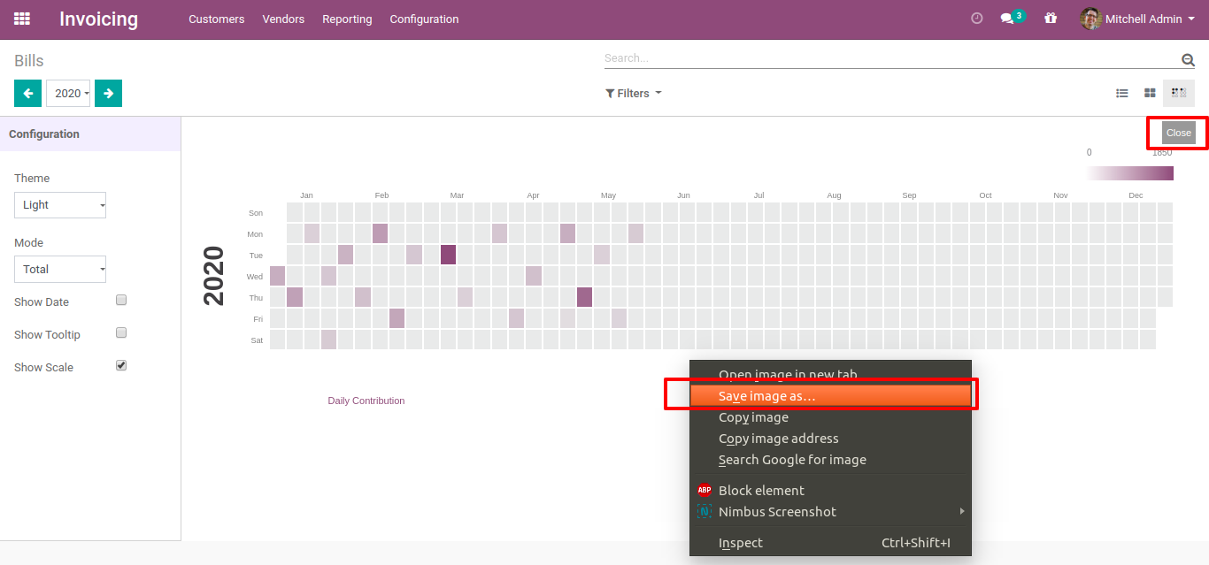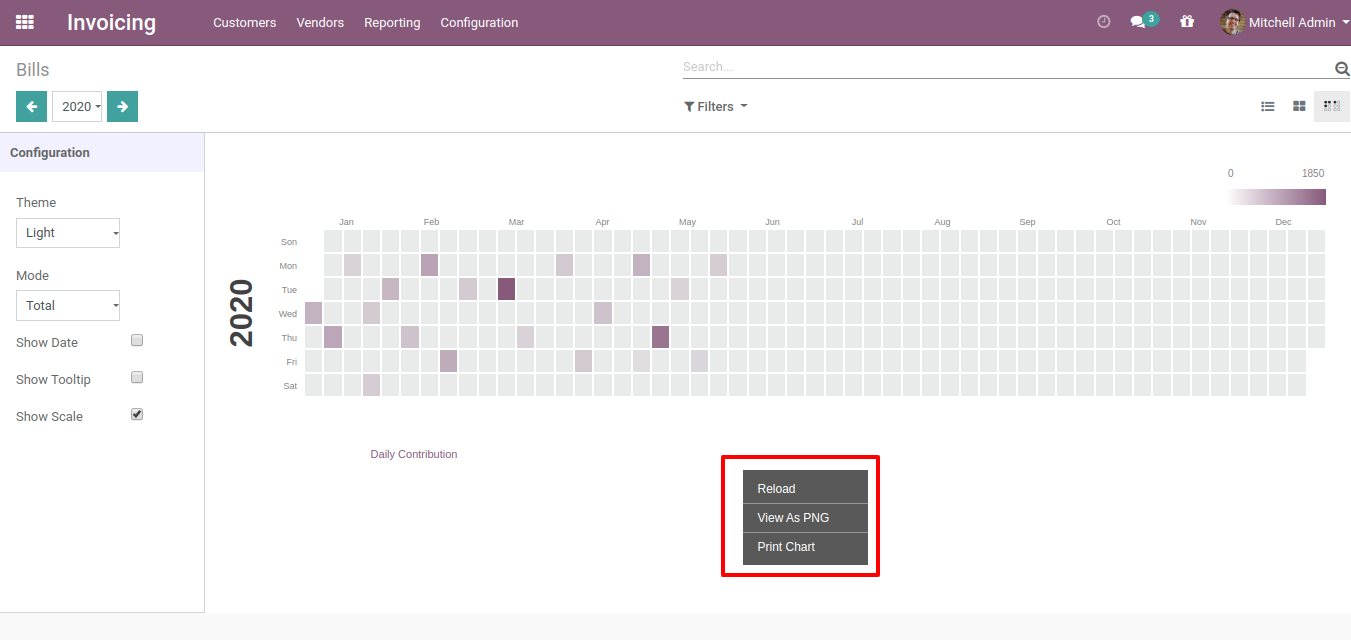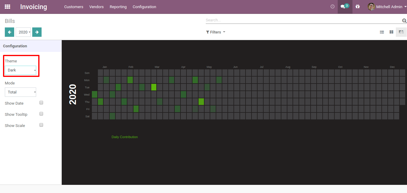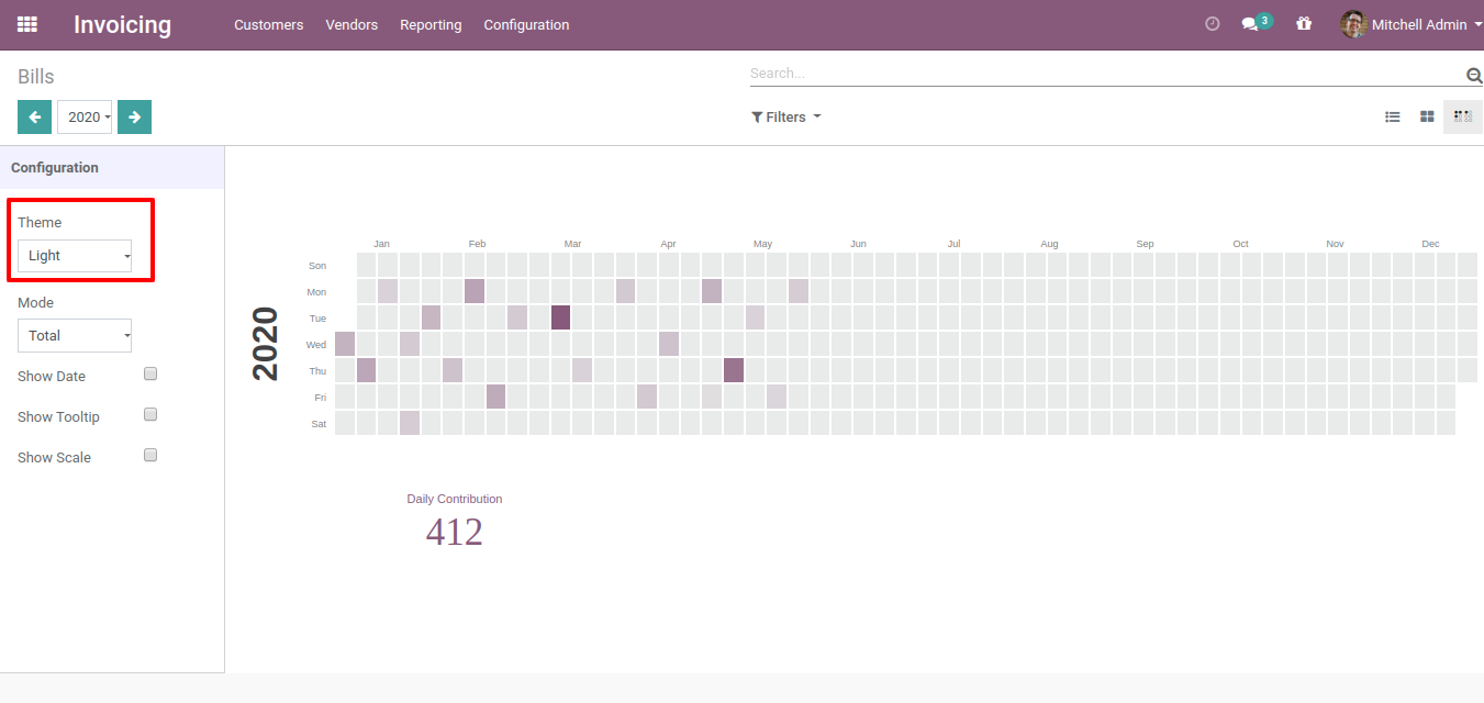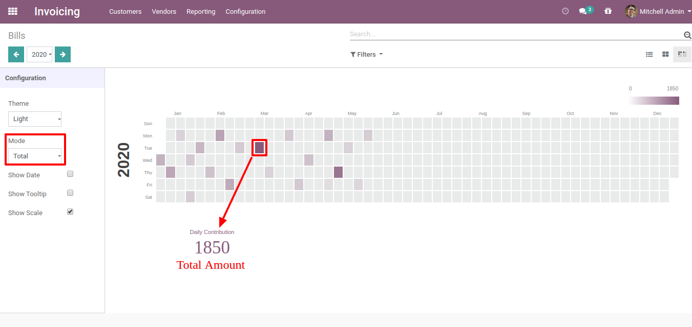 • Here, Calendar char view is created for vendor bills for the year 2020.