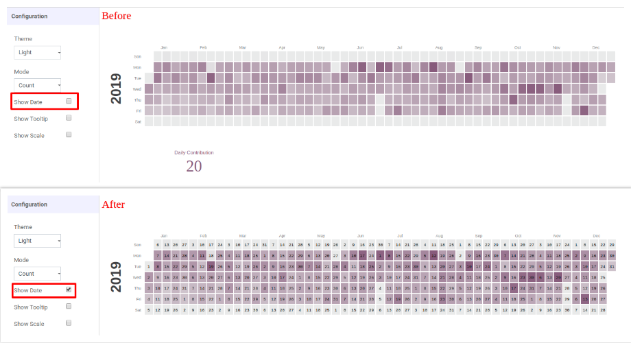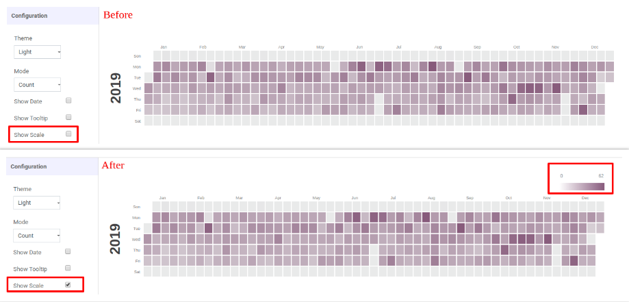 A calendar chart is a visualization used to show activity over the course of a long span of time, such as months or years. They're best used when you want to illustrate how some quantity varies depending on the day of the week, or how it trends over time.