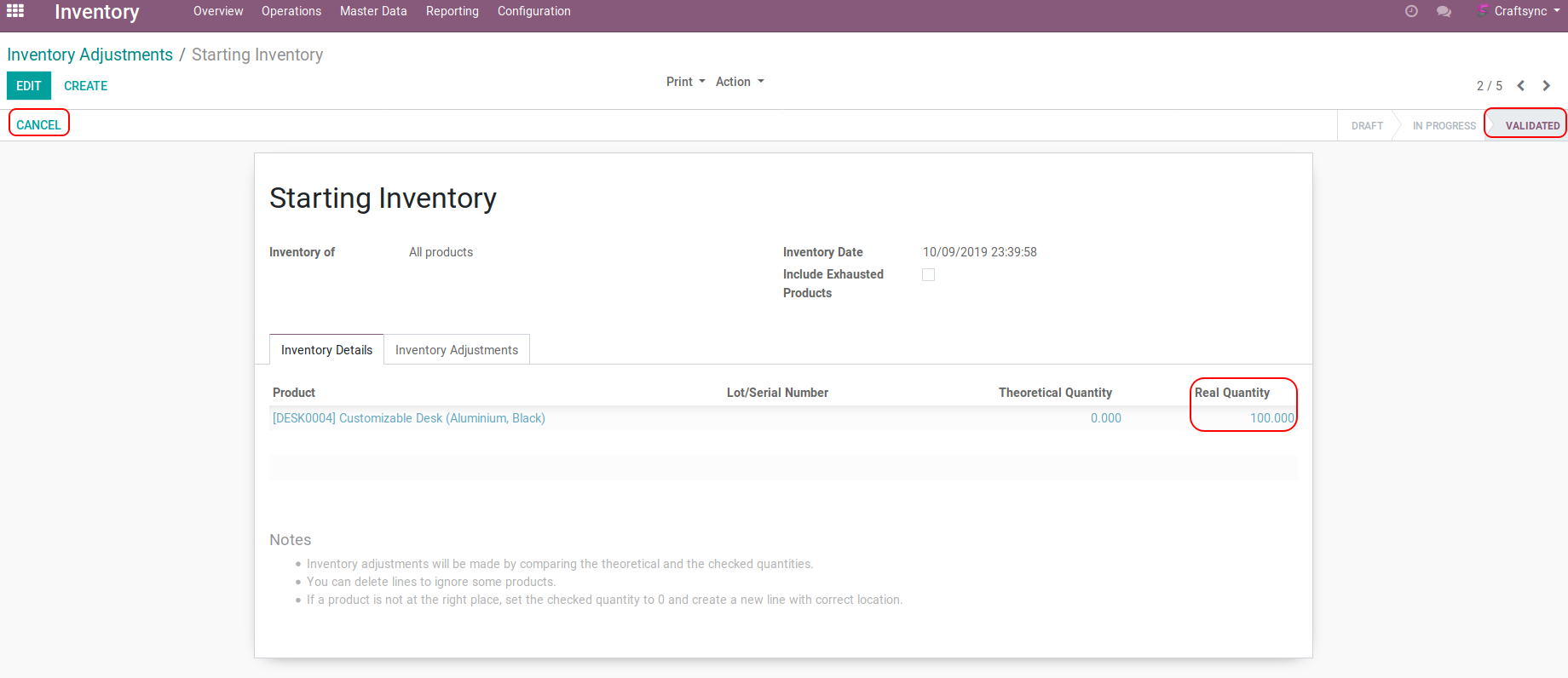 Inventory Adjustment at validated state.