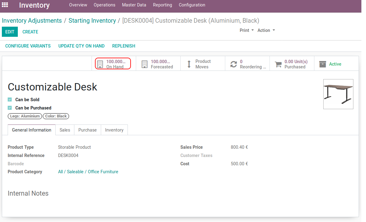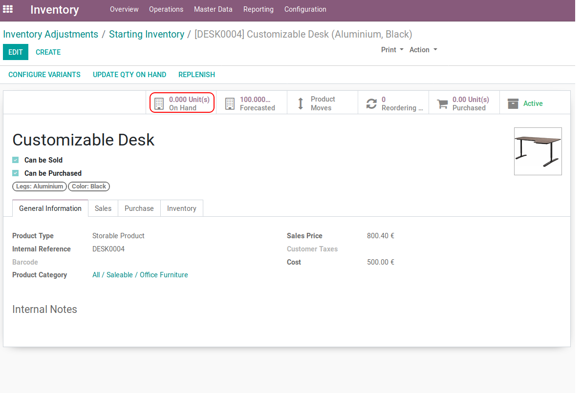 Customizable Desk product with 0.000 Unit(s) On Hand quantity.