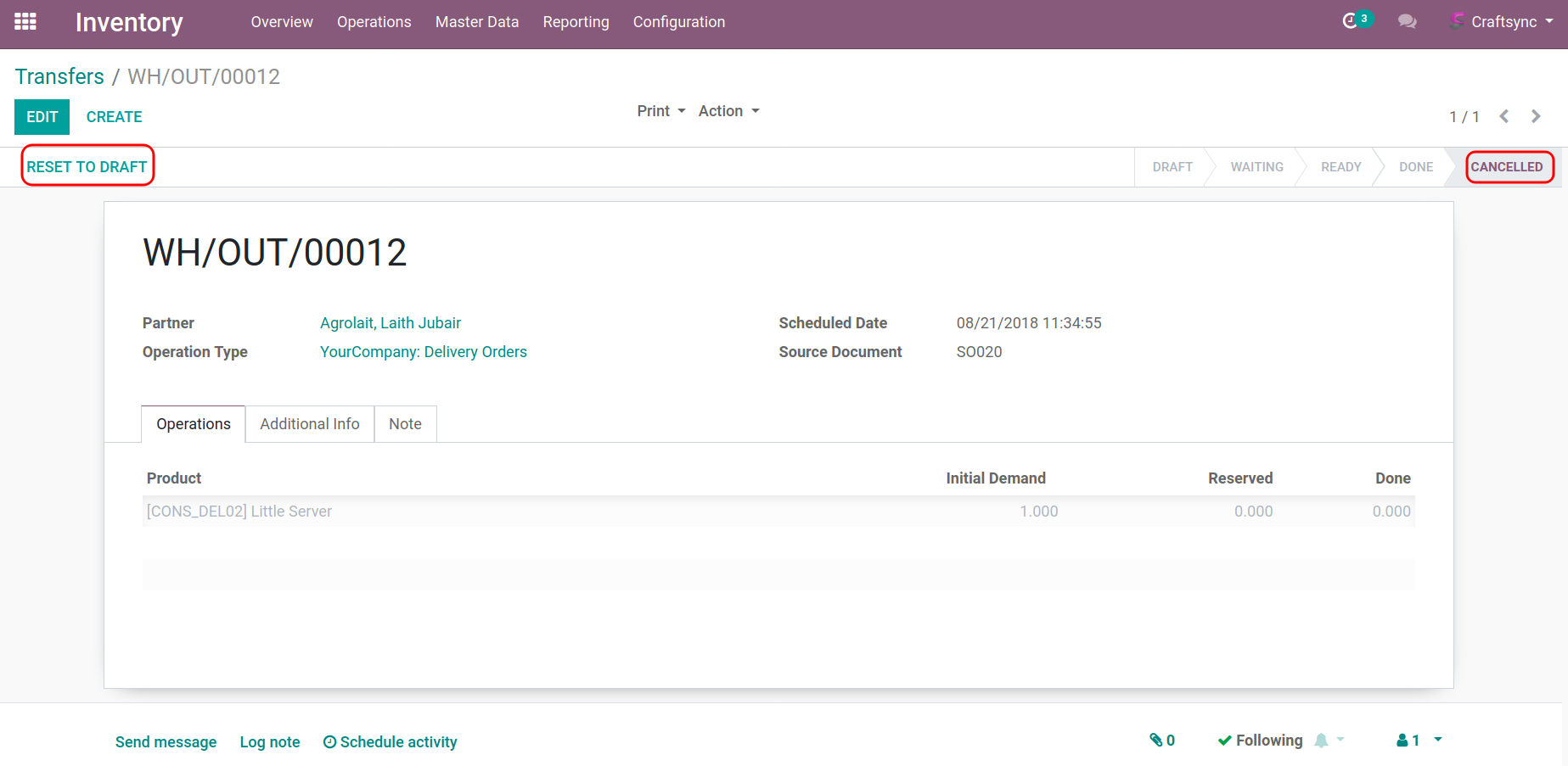 After cancelling delivery order, You can see the delivey is in 'Cancelled' state and user can delete that delivery. User can reset picking as well as from reset to draft button.