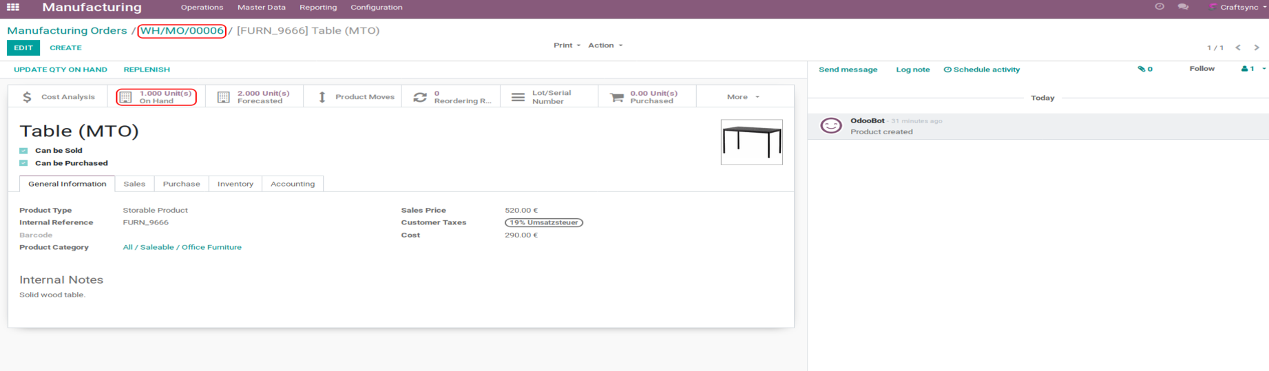 Manufacturing order with work order and inventory move and mo is on Done state.