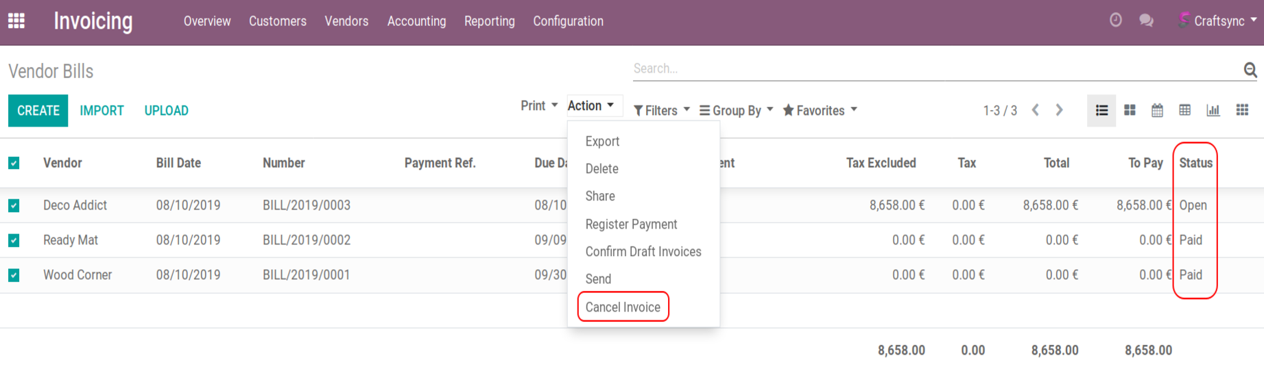 Following image shows in list view of Invoices User can select more than one invoice for cancellation: