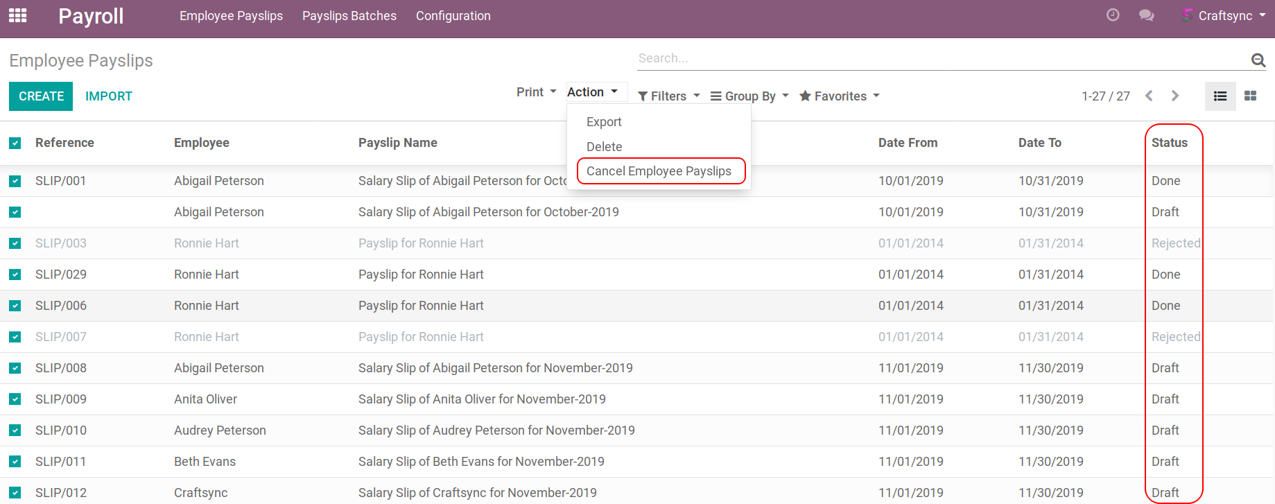 Following image shows in list view of Employee Payslips User can select more than one order for cancellation:
