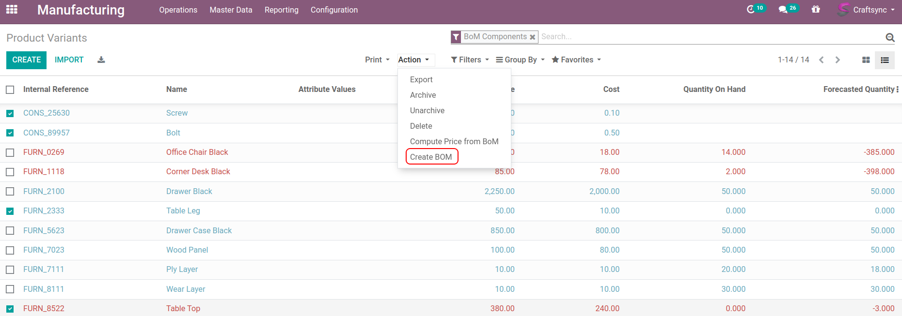 When user click on create bom action below popup will display. User can select manufacturing product of the bom.