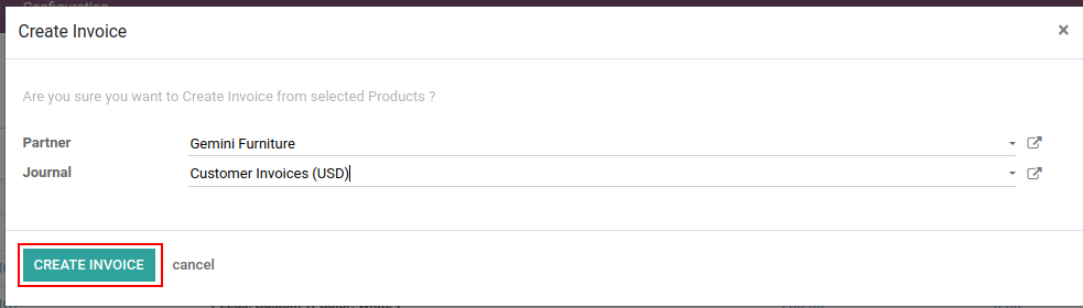 When user click on create invoice or bill action below popup will display. User can select customer of the order.