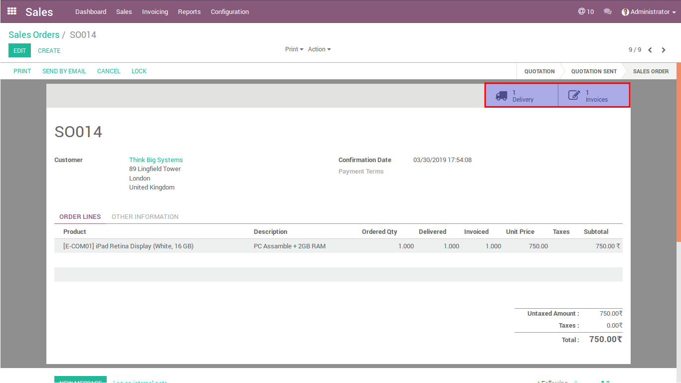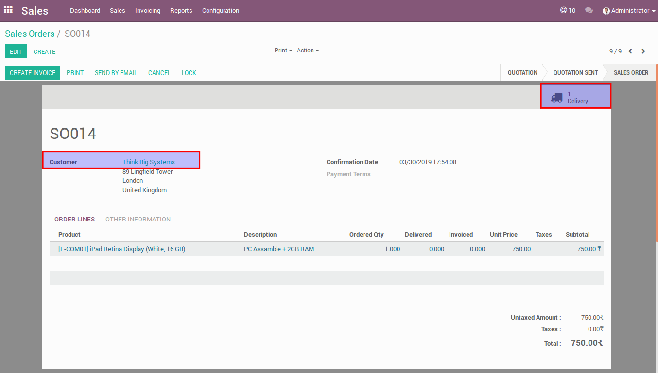 . Below image is a sale order without Customer Invoice.