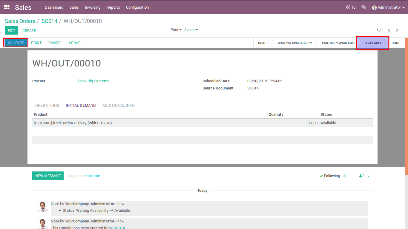 . Below image is a Delivery on available state and then create Customer Invoice when validate it.