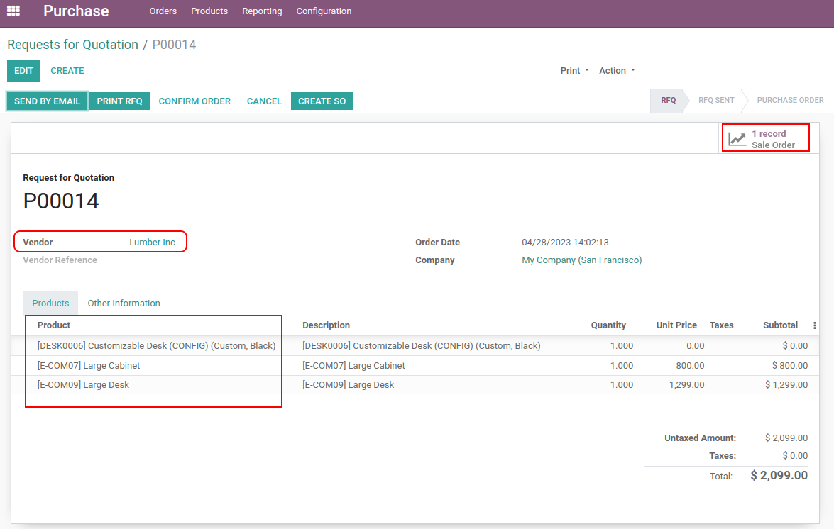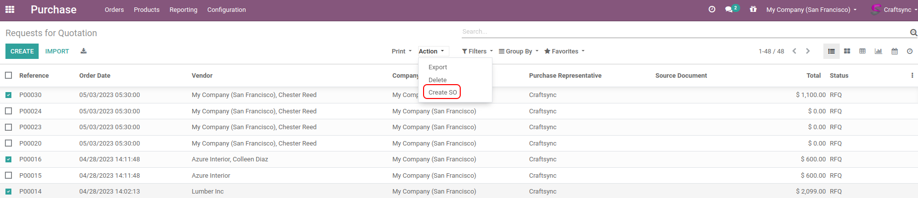Purchase order having "create SO" action.
