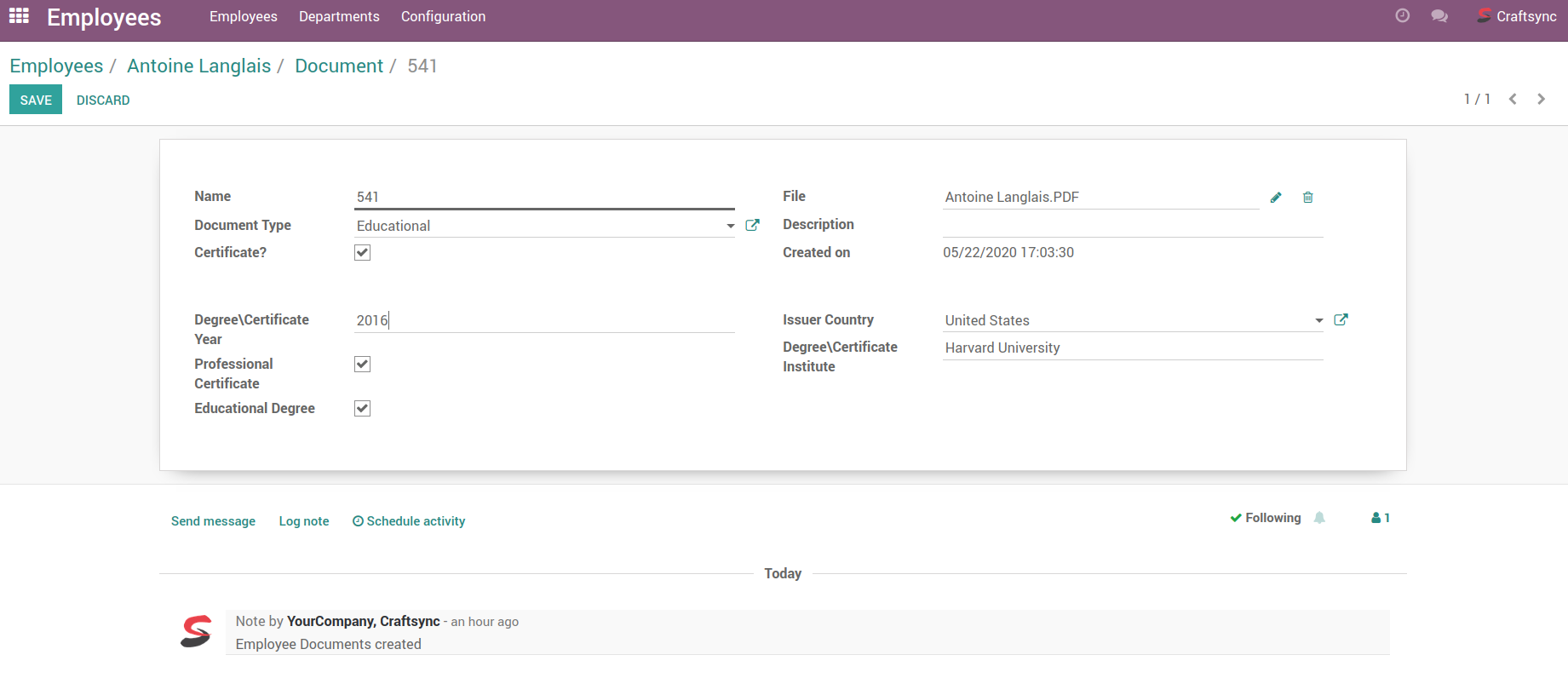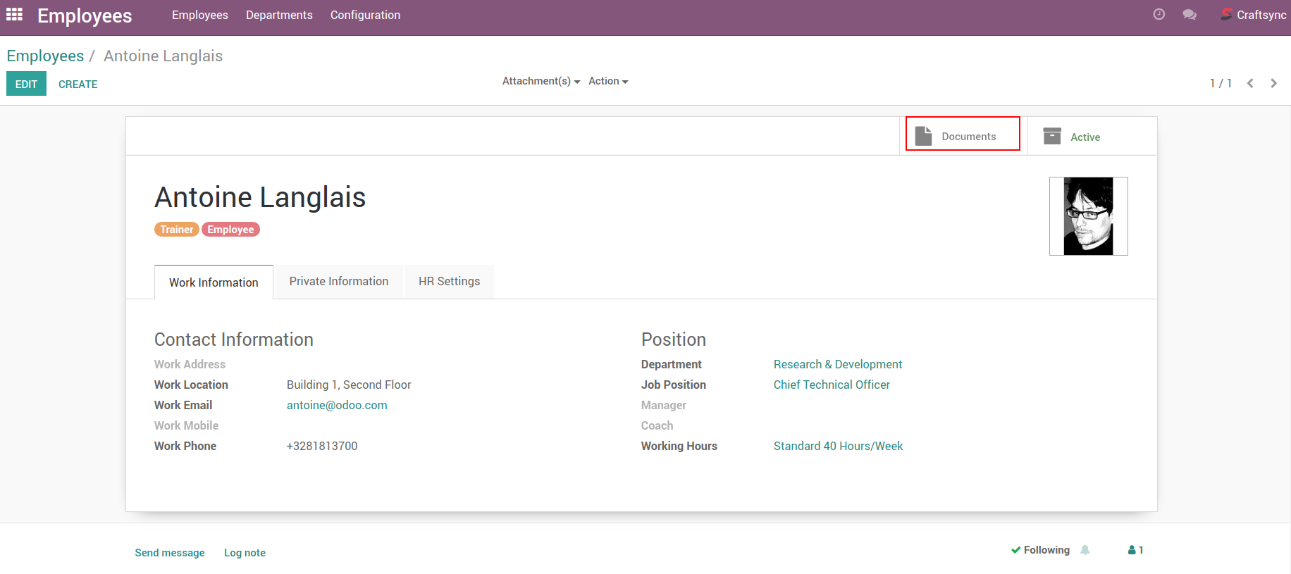 Document Smart Button page in Employee's view.