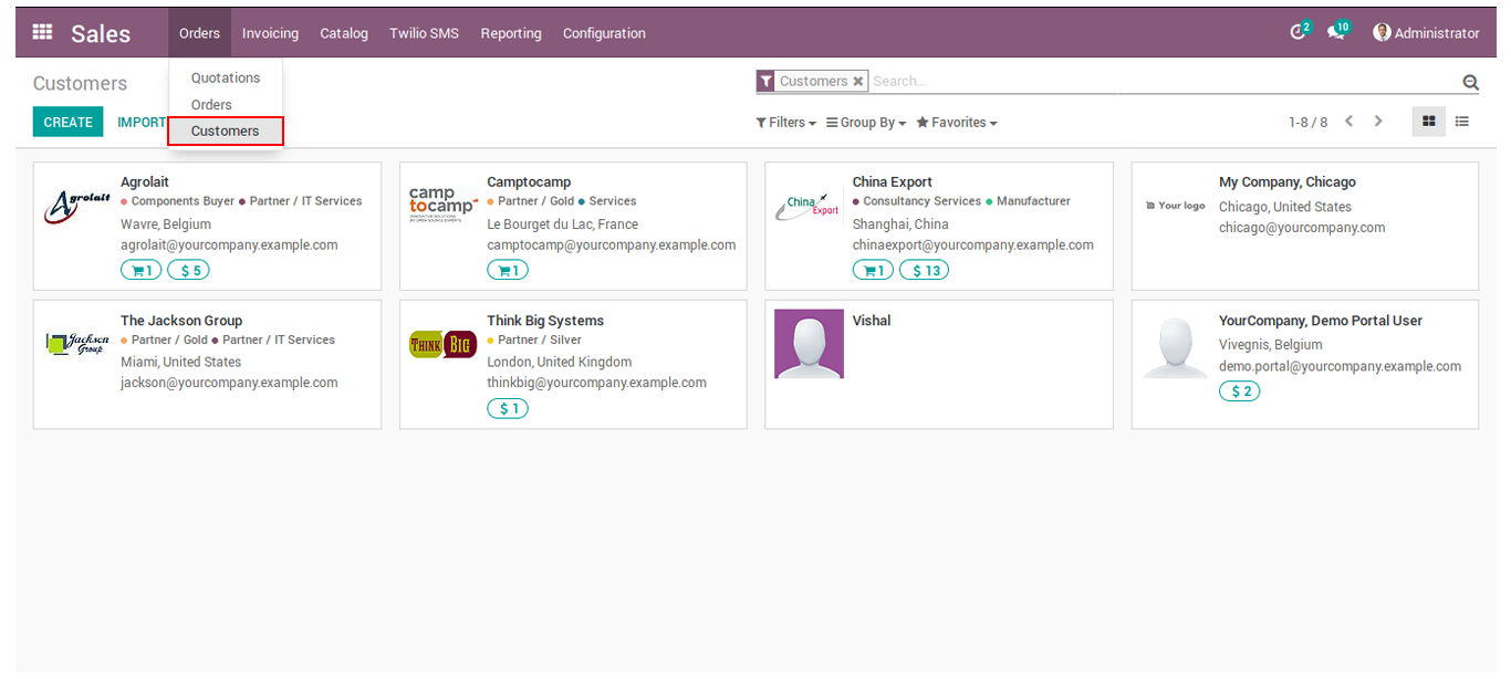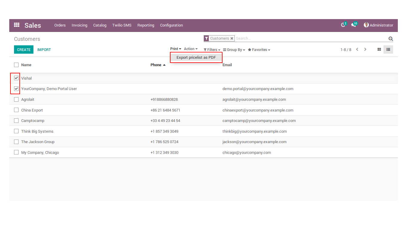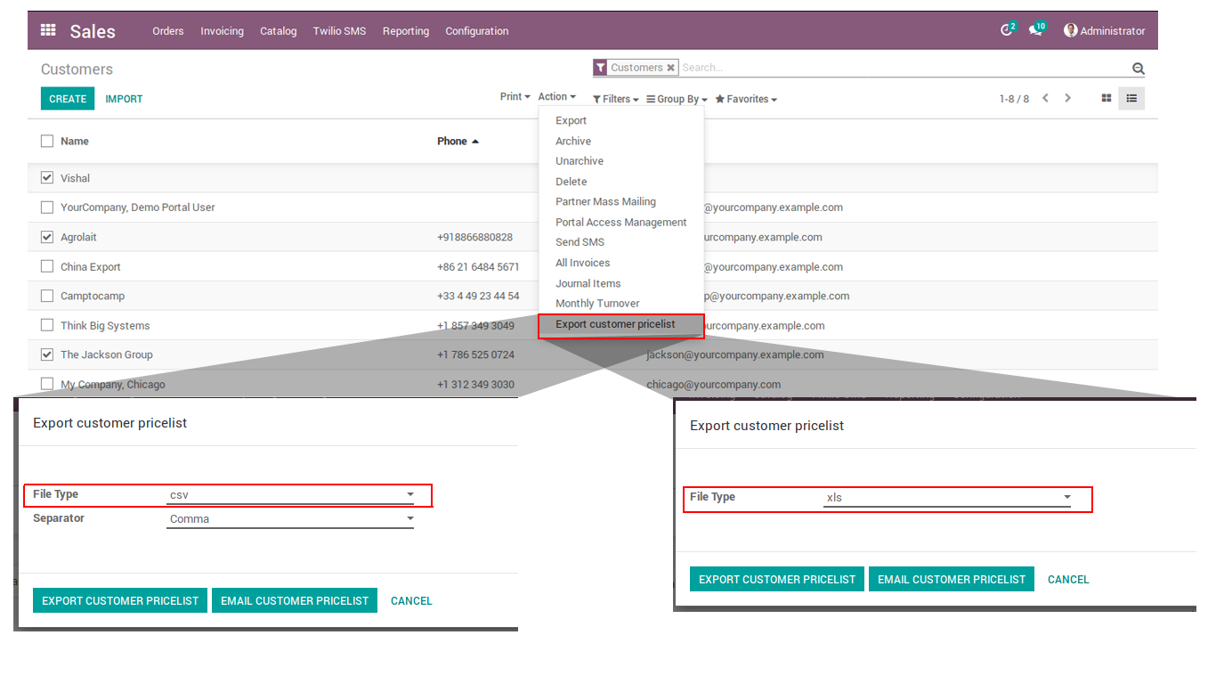 • Select the customers >> click on Print >> Click "Export pricelist as Customer".