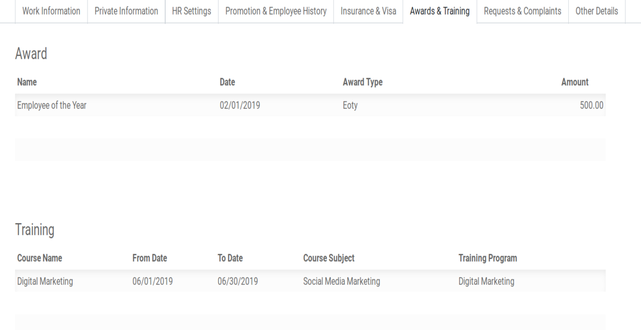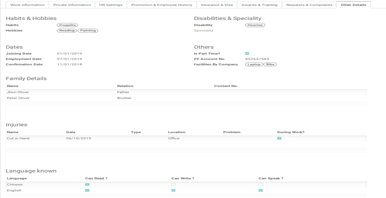 Above Image Is for Hobbies,Habits, Disablity,Speciality, Dates, Facelities, Family Members & injuries and Language Known by Employee.