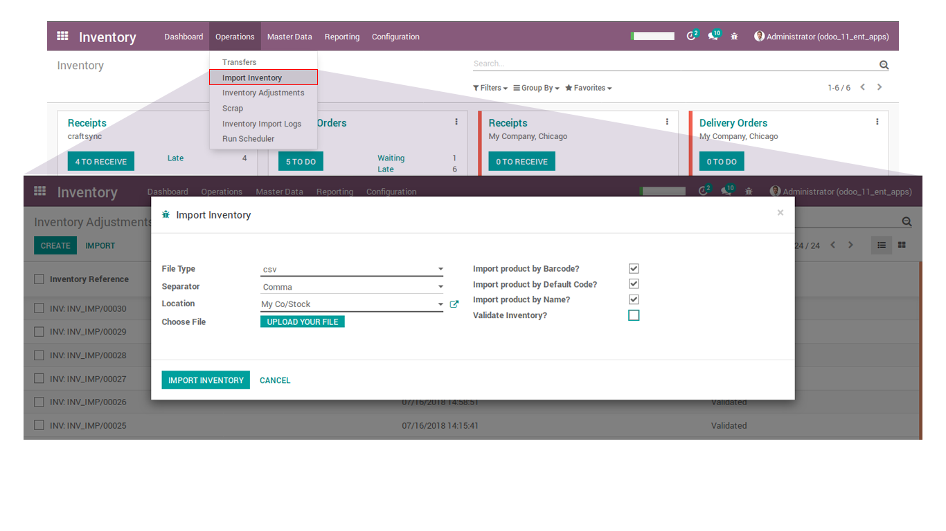 - Supported with less data like you can import inventory with only product name, barcode or Internal Reference (Default code) within same file.