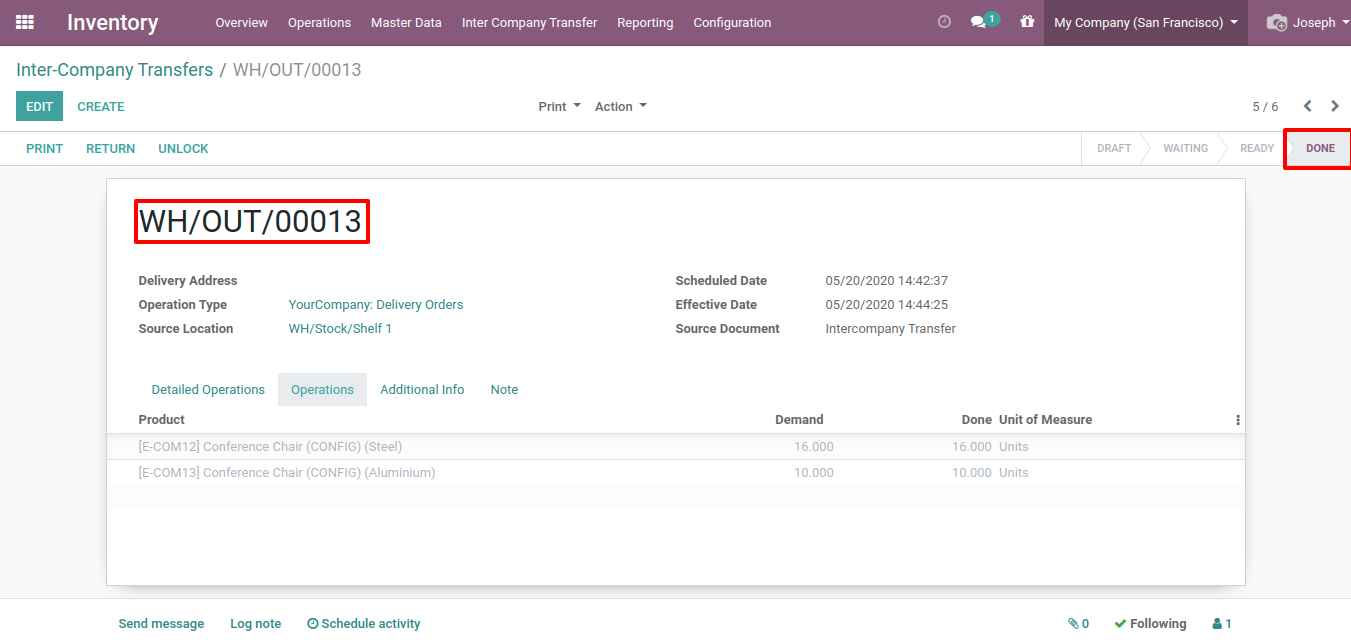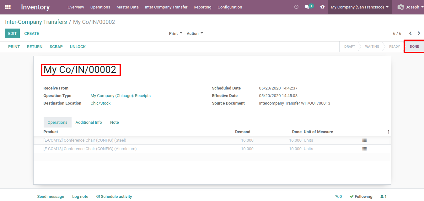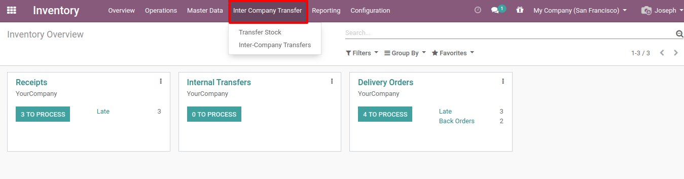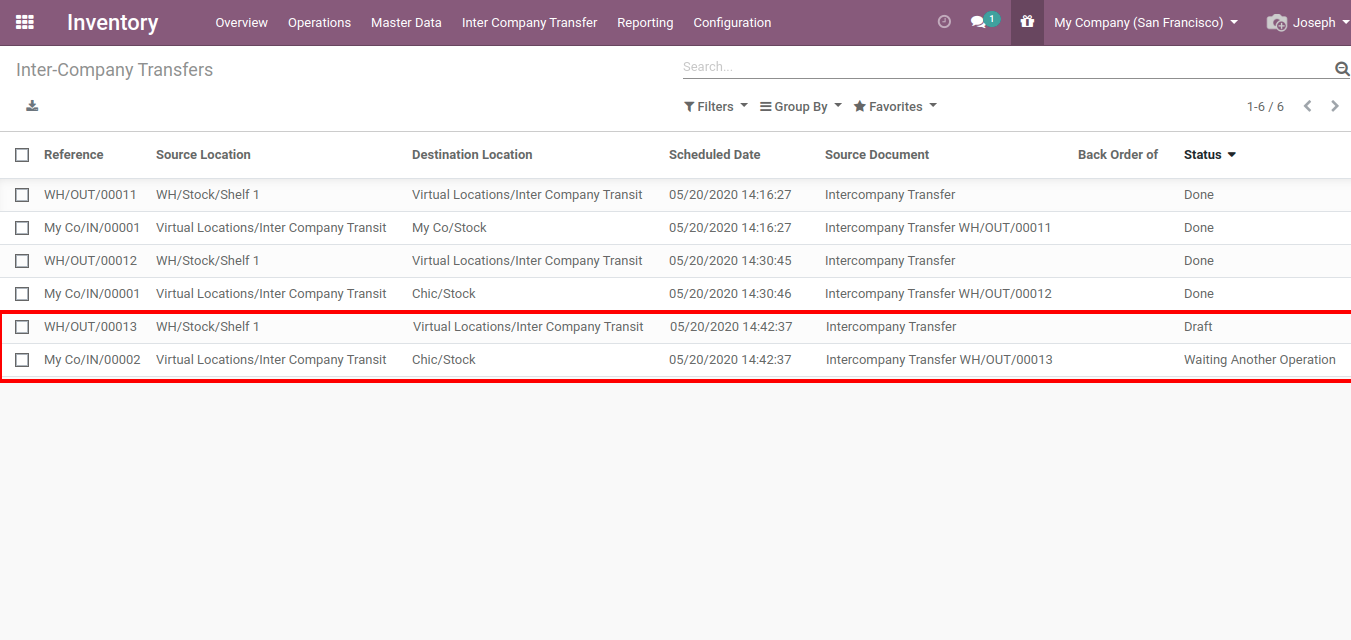 • Click on: Inventory > Inter Company Transfer > Inter-Company Transfers menu to see transfers created by wizard.