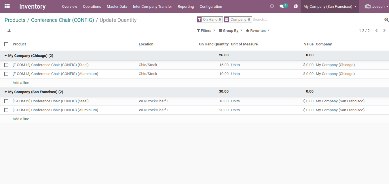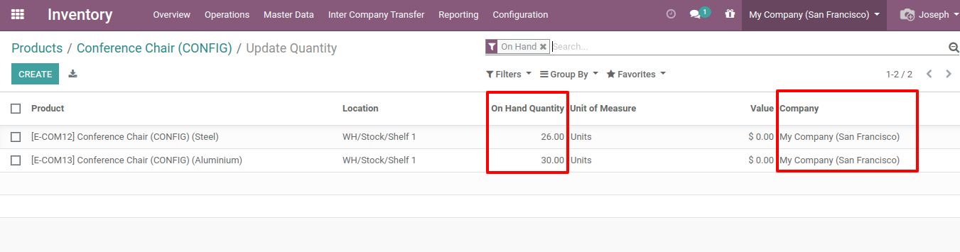 • Here, [E-COM12] and [E-COM13] product's on hand quantity in My Company (San Francisco) is shown.