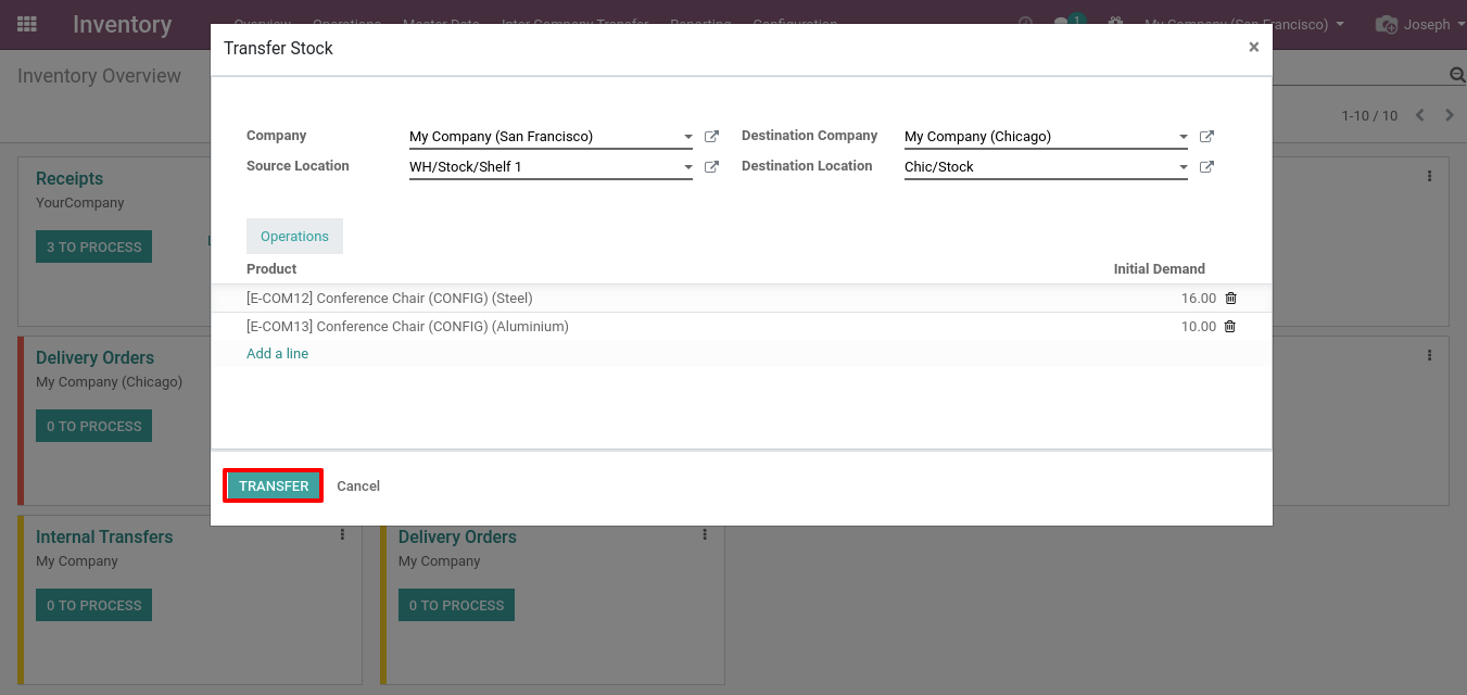 • In this wizard user can select source company, source location, destination company, destination location and products to transfer.
