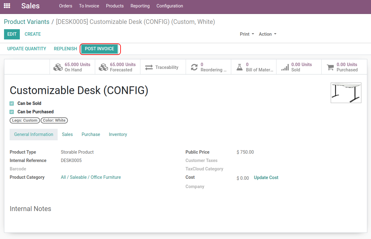 Product detail view having Post Invoice Button.