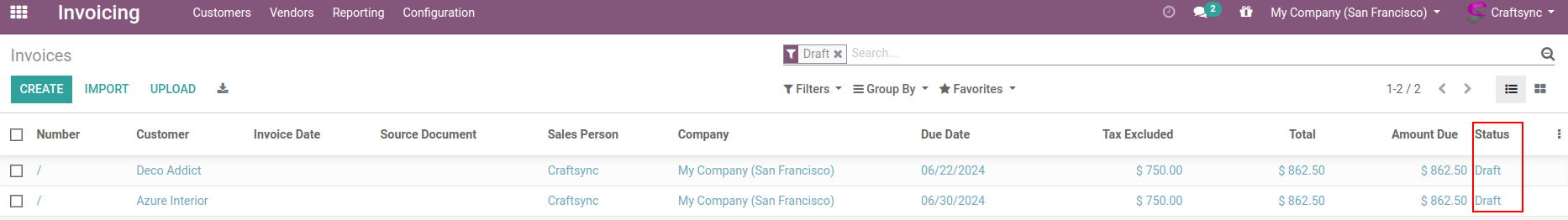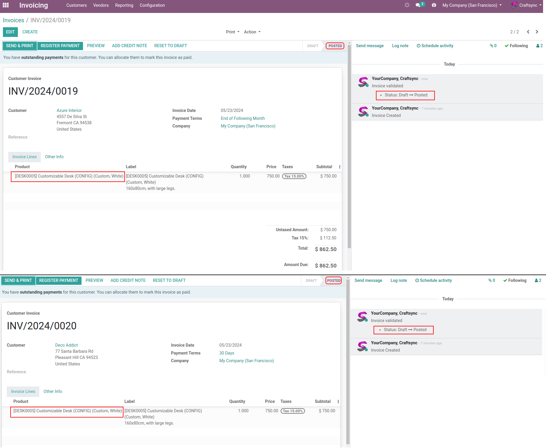 Here are Invoices whoes having Customizable Desk as a product, Invoice list view having Two Invoice are in Draft state.