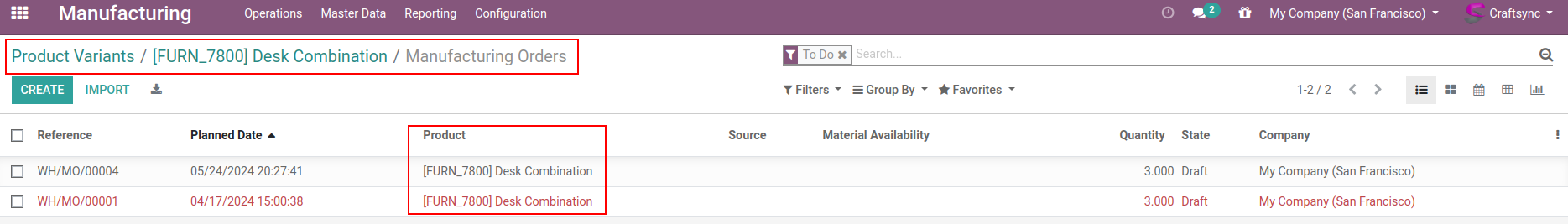 Here are MO whoes having Table(MTO) as a product, MO list view having 2 Manufacturing Orders.