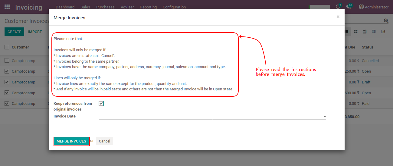 - This application provides facility to merge different states of invoices even with registered payment.