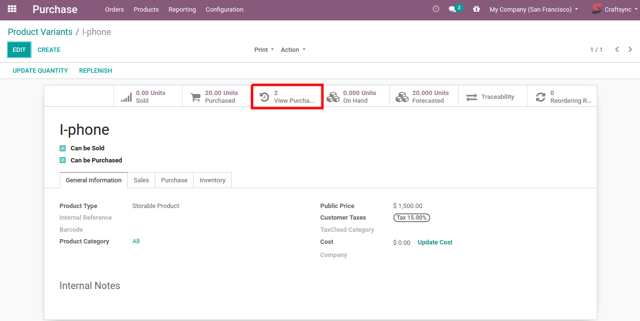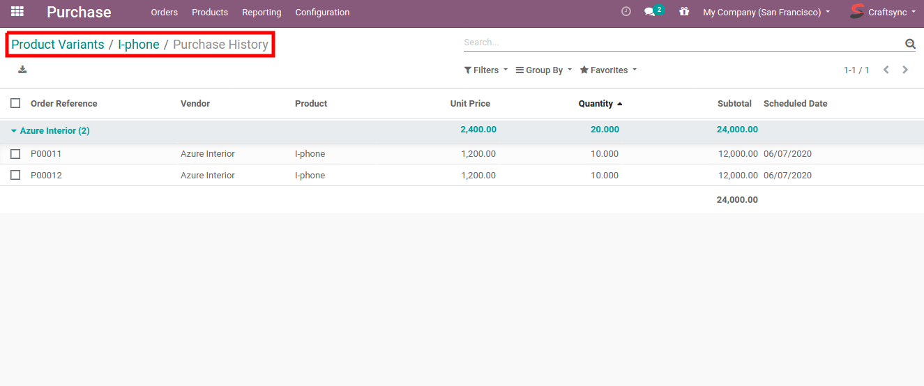 • visible view after click on purchase history smart button in product.