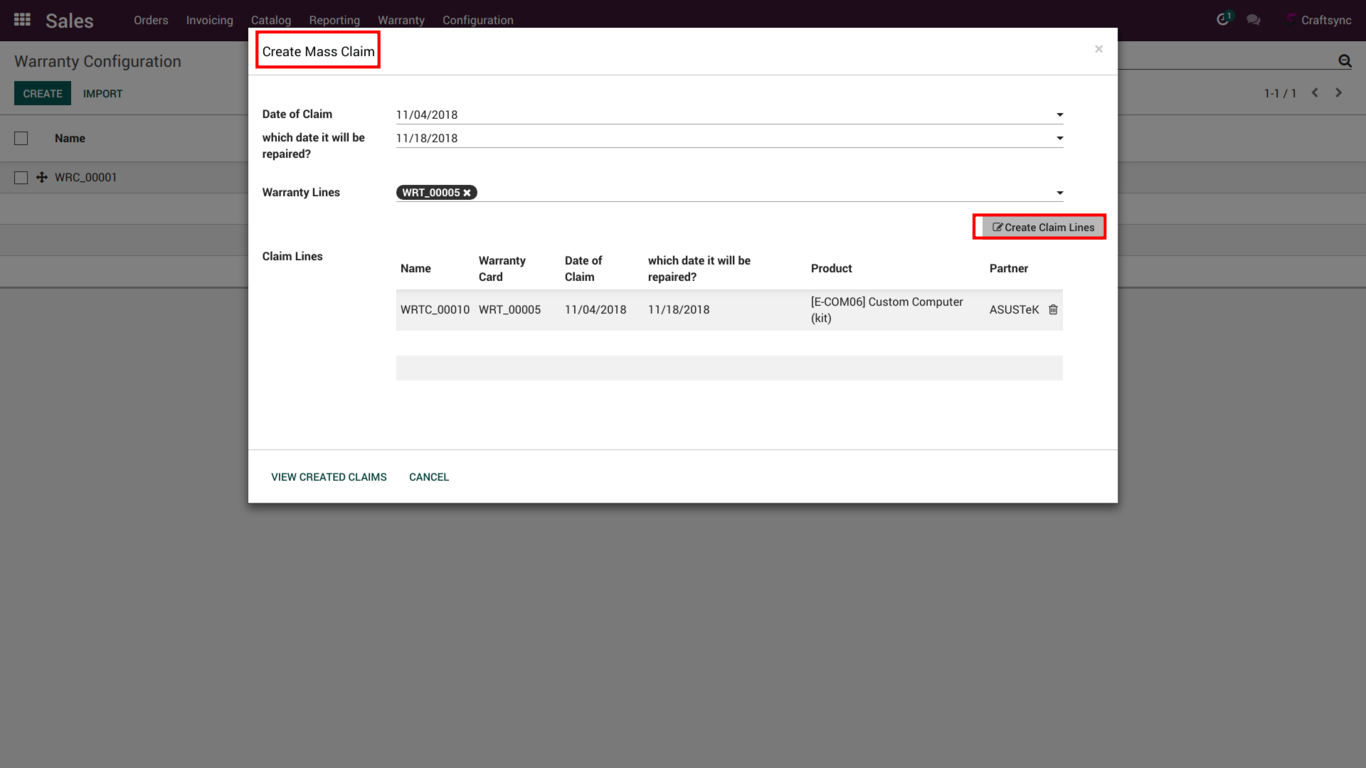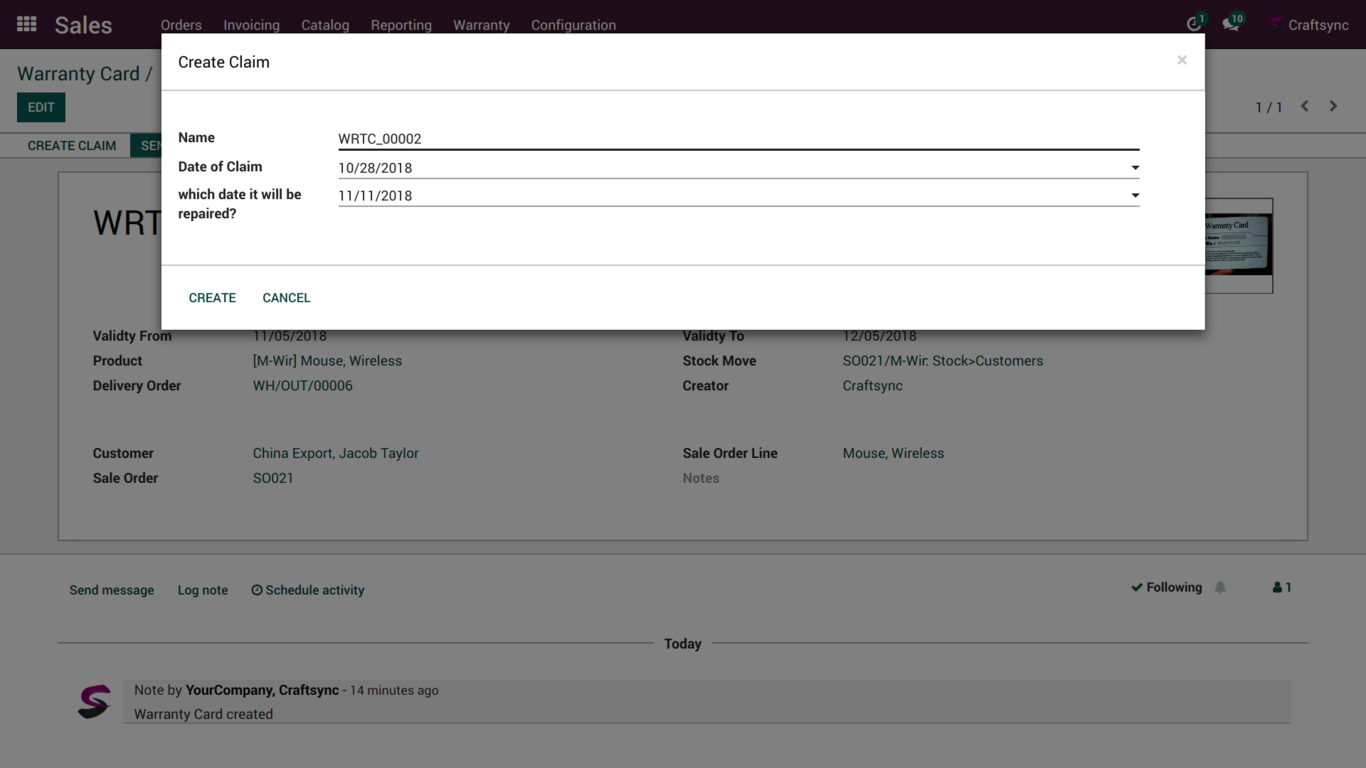 Above Image is shown when user will click create warranty button in delivery line.