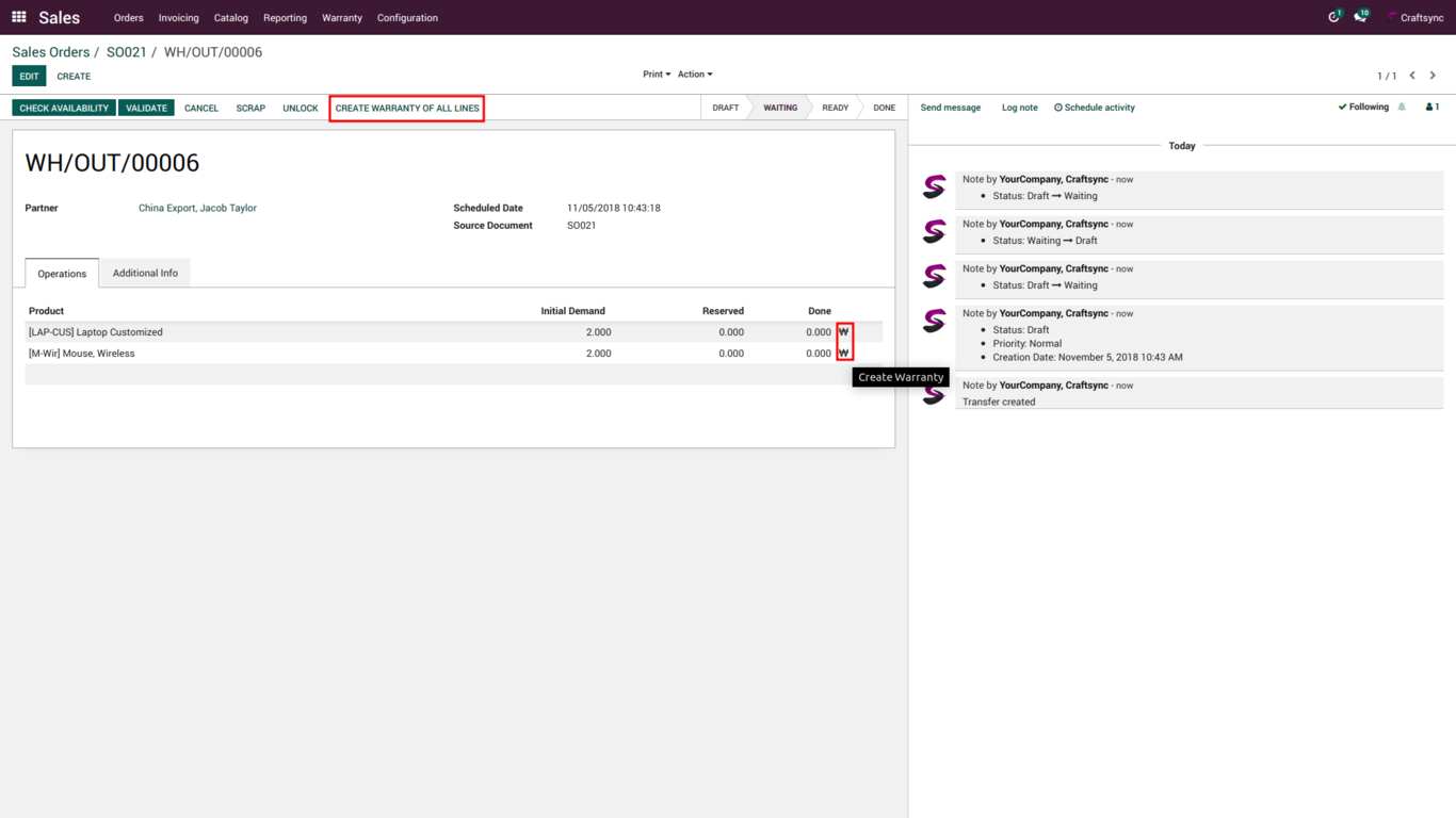 User will create warranty from delivery line and also create from all delivery line at one click.