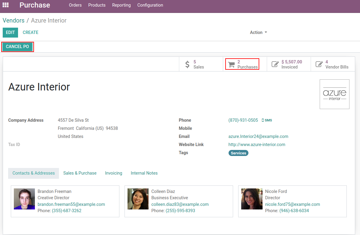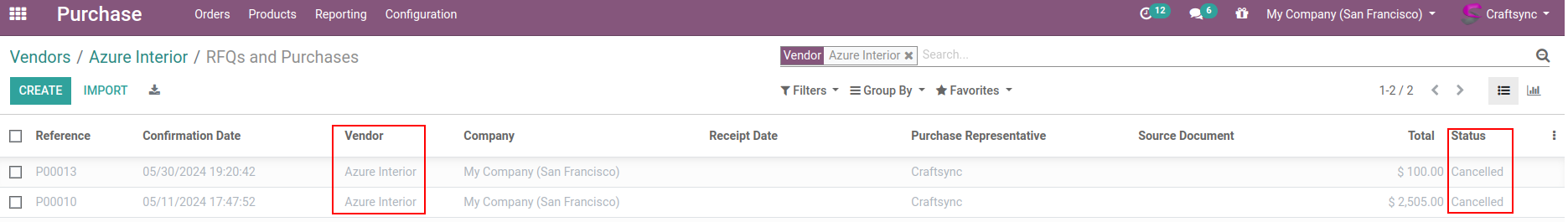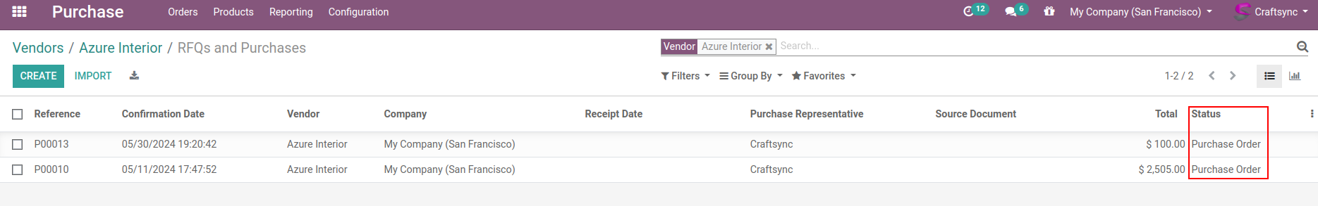 Purchase orders list view, having Two PO whose vendor name as Azure Interior & both PO are in Purchase Order state.