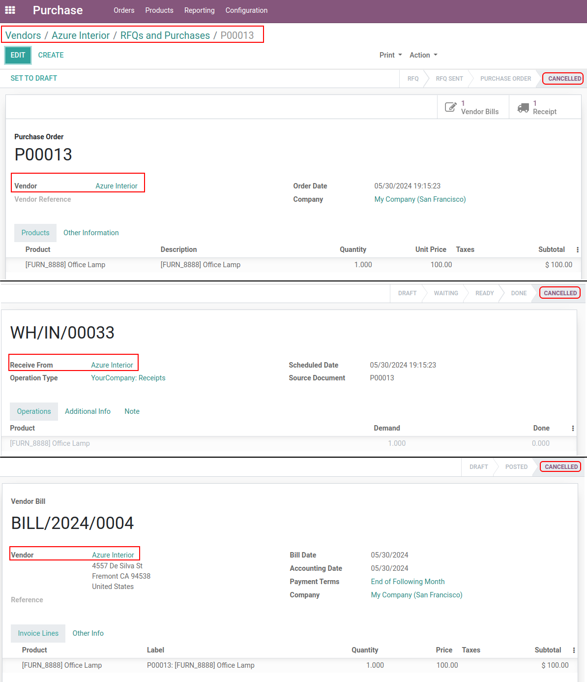 After clicking Cancel PO button All POs are now in Cancelled state.