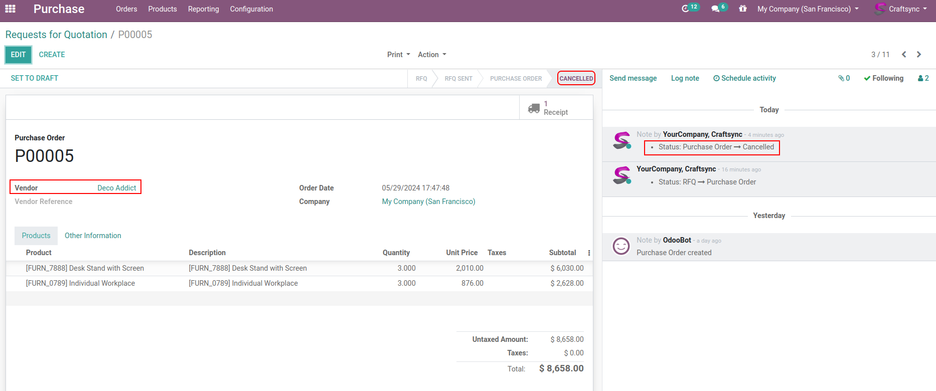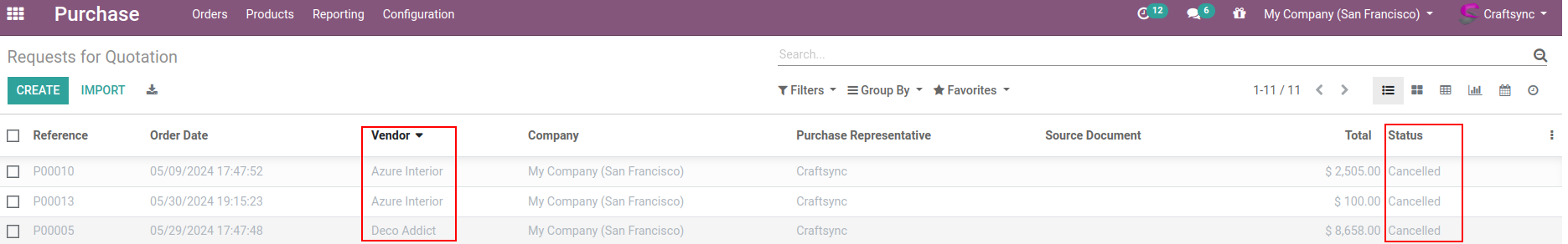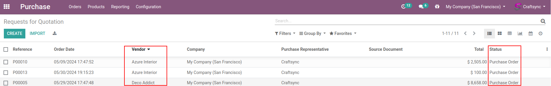 Here are Purchase orders list view, having Three PO whose vendor as Azure interior and Deco Addict are in purchase order state.