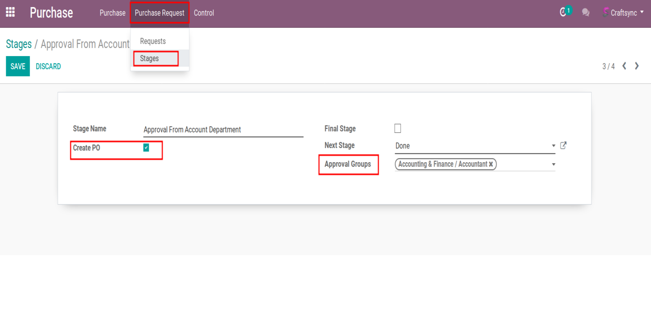 After installation of this application menu display in purchase --> purchase request -->stages. Above configuration of stages based on user need. Based on sequence this will display in request view. And based on access group request in approved by only that group.