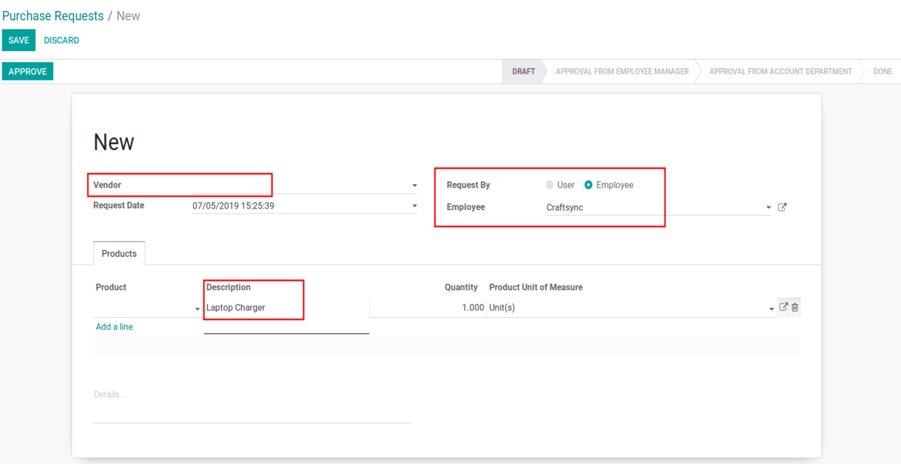 Above Image is of request by user or employee and stages that user have configured and vendor and product isn't require if user have not idea of that. And based on next stage configuration stage will change on approve button click.