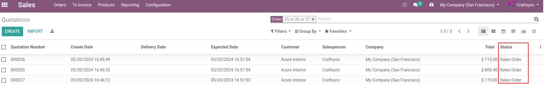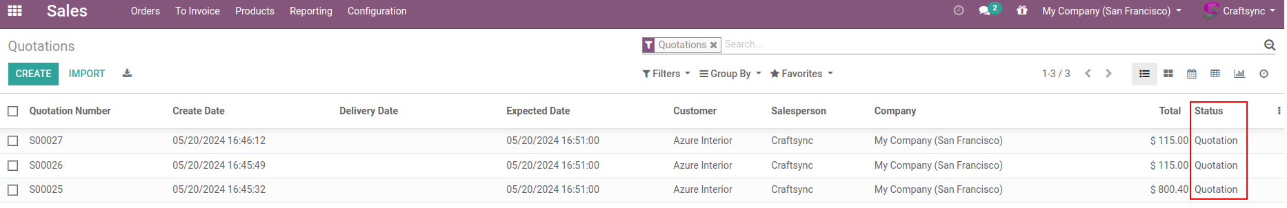 Here are Sale orders list view, having three SOs are in Quotation state.