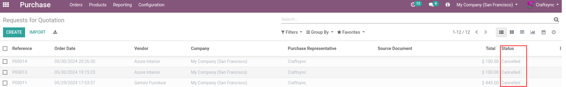 Here are Purchase orders list view, whose having Office Lamp and Office Chair as product. PO are in Purchases order state.
