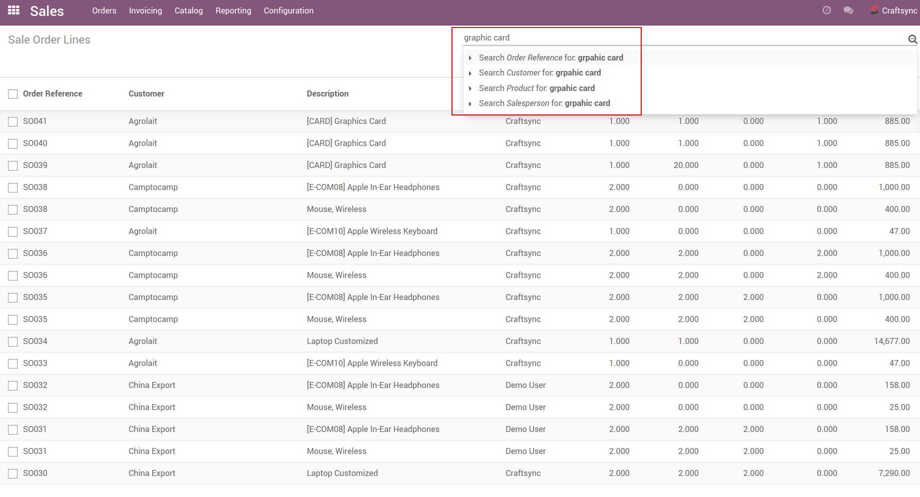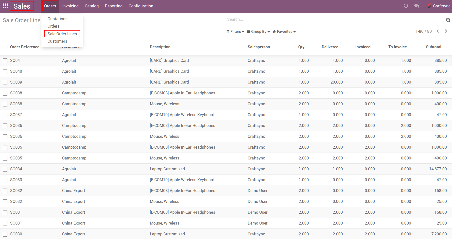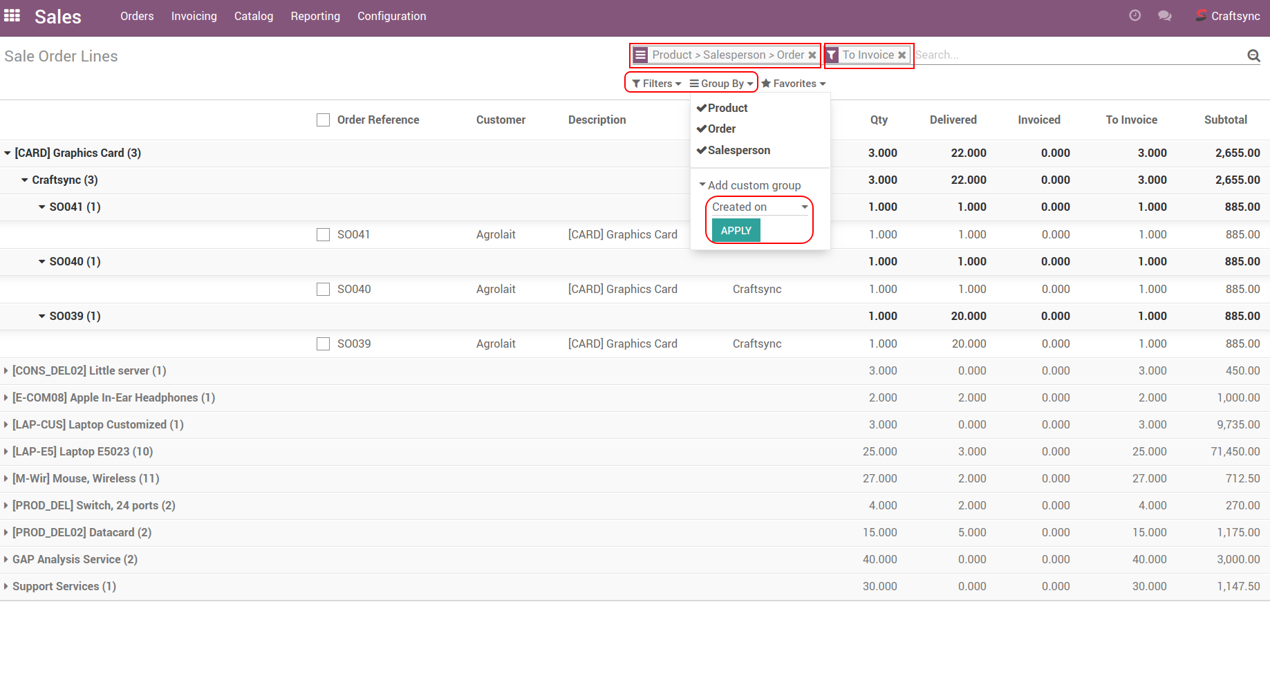 • sale line with group by product,saleperson,order and filter of to invioce. We can add create on filter from add custom group. Easy track of product & qty of delivery and invoice.